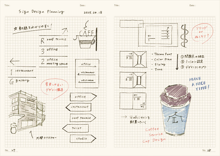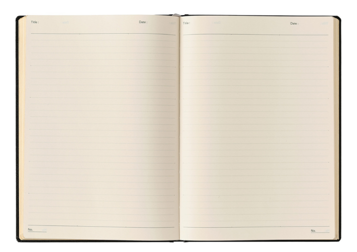 繰り返し使ってもへたりにくいハードカバーに、最上級クロスを使用。高級感を漂わせつつ、背には180度フラットに開く「ホローバック製本」を採用しました。机の上でも手に持っても書きやすく、毎日の記録を心地よく続けられます。