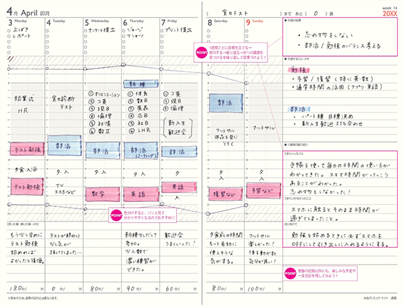 起床時間、勉強開始時間、就寝時間などに「〇」でチェック。基本行動時間を記録して、生活パターンの習慣化に繋がります。