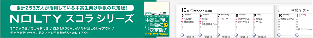 | 付属資料 | 使い方ステップ、年間目標、定期テスト記録表、1年間の振り返り、時間割表、寄せ書きページ |
