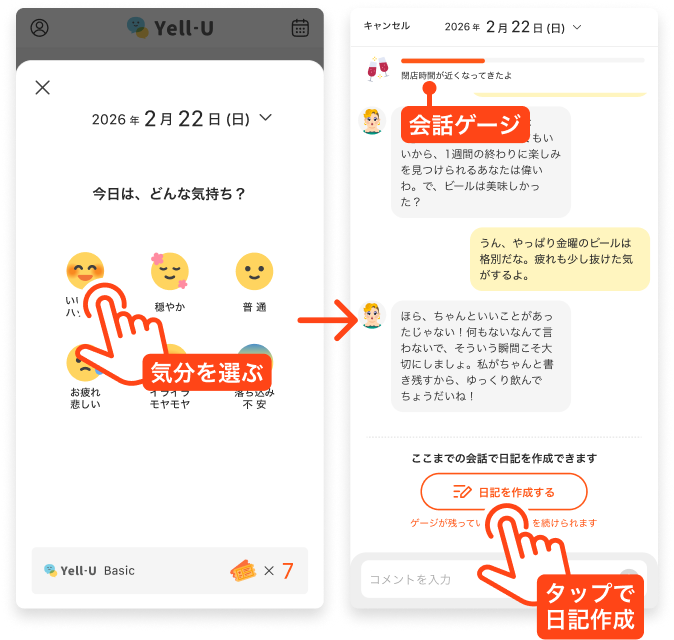 プラスボタンから気分を選ぶと会話が始まり、会話が進むと日記作成ボタンが表示されます。すぐに日記を作成することも、会話ゲージがなくなるまでおしゃべりを続けることもできます。