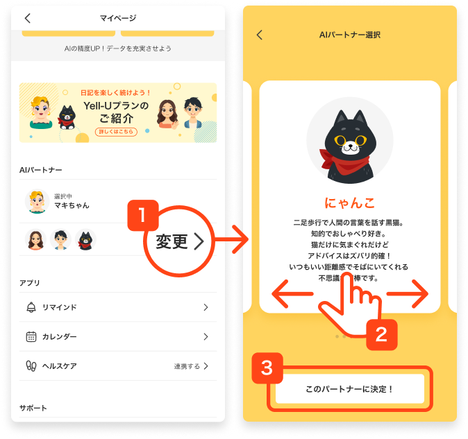 AIパートナーは、マイページの「AIパートナー」からいつでも変更できます。キャラクターにはそれぞれ個性があるので、いろいろ試しながら、相性のよいパートナーを見つけてみてください。