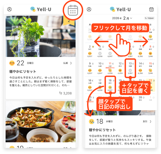 カレンダーアイコンをタップすると、月間カレンダーが表示されます。顔アイコンは日記がある日。プラスアイコンは日記がない日を示しています。カレンダーから日記を見たい日に移動したり、日記を追加したりできます。