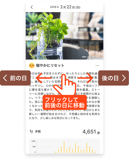日記詳細画面で左右にフリックすると前後の日記を続けて読むことができます。