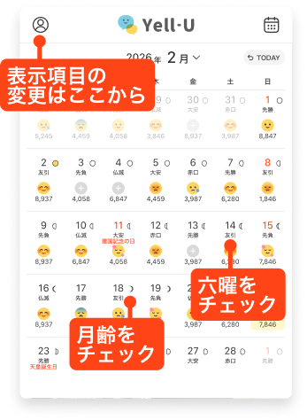 六曜や月齢など、NOLTYらしい暦情報がエール・ユーでも楽しめます。月間カレンダーに表示する暦の項目は、マイページからお好みに合わせてオン・オフの切り替えが可能です。