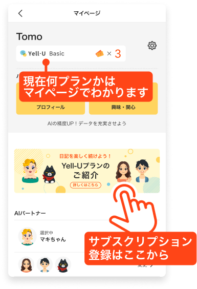 Premiumプランでは、1日記あたりに会話できる量がBasicプランの10倍になります。まずはBasicで使い心地を試して、「もっと話したい」と感じたら、Premiumをご利用ください。