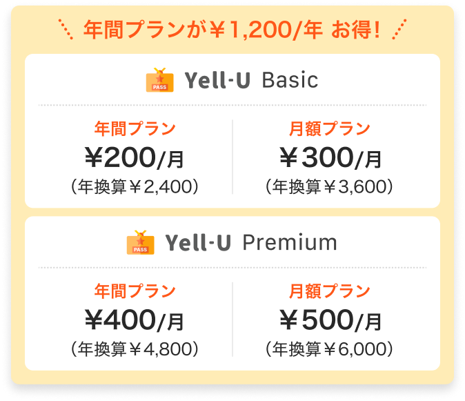 サブスクはBasic/Premiumともに年間プラン・月額プランがあります。年間プランは1年分の料金を一括でお支払いいただく分、月額プランで継続した場合に比べて1,200円お得になっています!