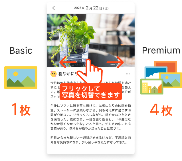 Basicプランでは日記の写真登録が1枚までのところ、Premiumプランでは4枚までOKに!よりたくさんの思い出を日記に保存しておくことができます。