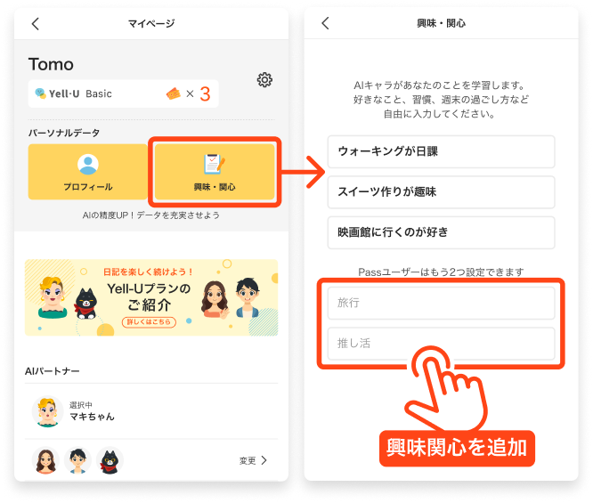 Premiumプランでは、「興味・関心」に登録できる数が3→5個に増え、AIパートナーとの会話がよりあなたに寄り添ったものになります。