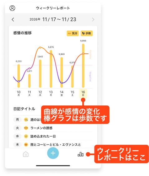 ウィークリーレポート画面では、あなたの感情の動きを1週間単位で振り返ることができます。