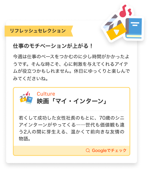 週5日以上日記を書くとお楽しみが!ウィークリーレポートで、あなたの今の気分に合わせて週末のリフレッシュにぴったりのアイテムをリコメンドします。